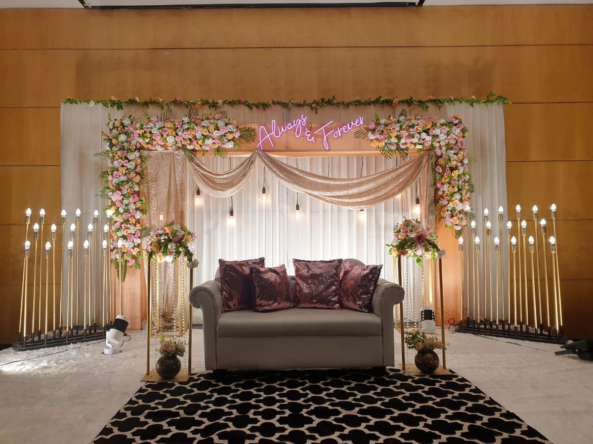 A premium romantic theme stage decoration featuring floral pillars, glowing LED signage and luxury seating. Designed to deliver a dreamy ambience for couple celebrations and photo sessions.