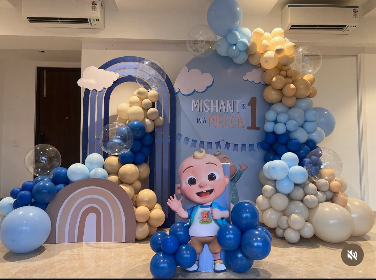 Celebrate your little one’s special milestone with our Baby’s First Birthday Balloon Decoration with Cartoon Cutout. Designed in soothing shades of blue, beige, and cream, this party backdrop is perfect for boys’ birthday celebrations. The setup features a fun cartoon baby cutout, pastel balloon garlands, rainbow arch, and cloud accents – creating a joyful and Instagram-worthy party atmosphere.