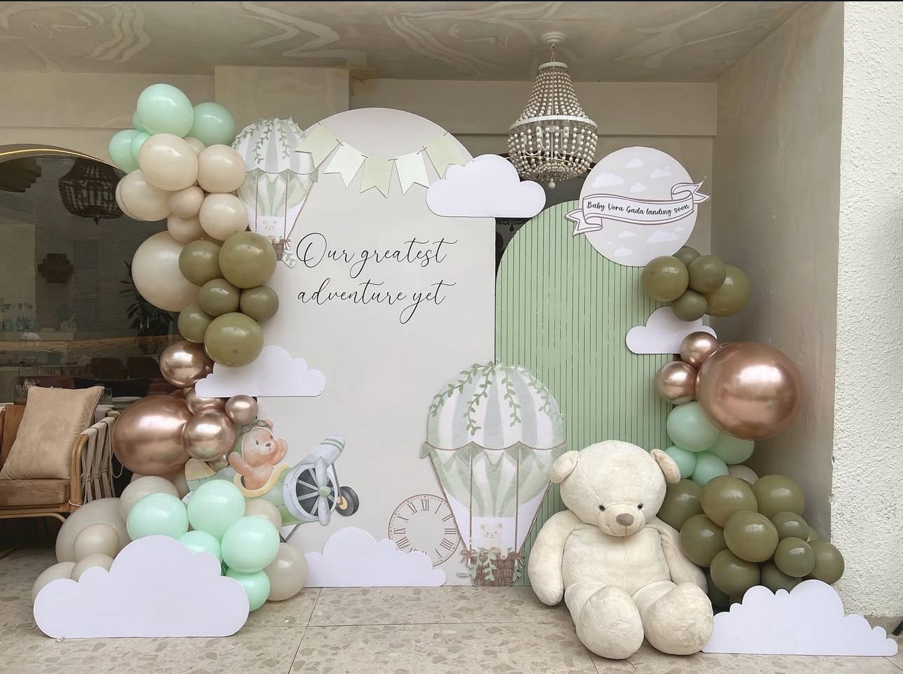 The “Our Greatest Adventure Yet” theme highlights joy, love, and new beginnings. With hot air balloons, dreamy clouds, and cute teddy accents, this backdrop creates unforgettable memories and picture-perfect moments.