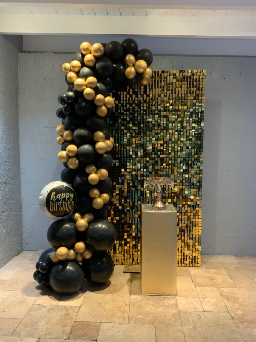 Elegant black and gold birthday decoration with shimmer backdrop and balloon arch — a classy setup for birthdays and milestone celebrations by Hyderabadi Events in Hyderabad.