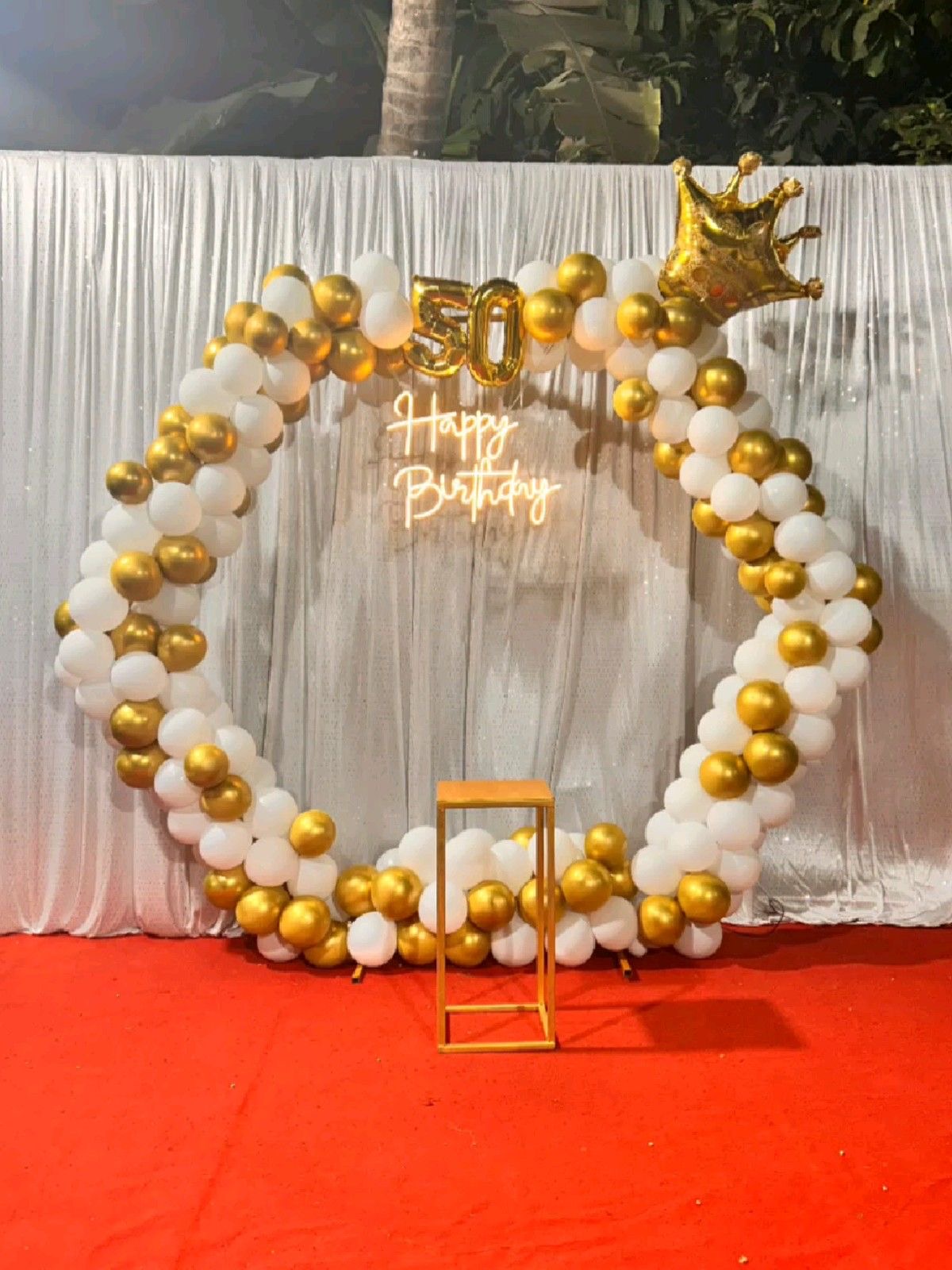 Premium birthday decoration package including balloon ring backdrop, milestone number balloons, neon signage styling and outdoor celebration setup ideal for 40th, 50th and milestone birthday parties.