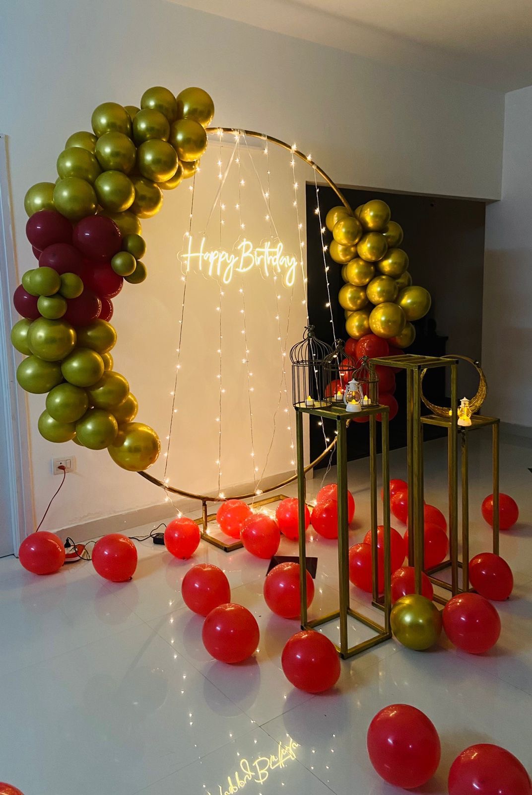 Special romantic birthday decoration package including LED signage, balloon styling, fairy light curtain backdrop and decorative stands ideal for couple birthday surprise celebrations.