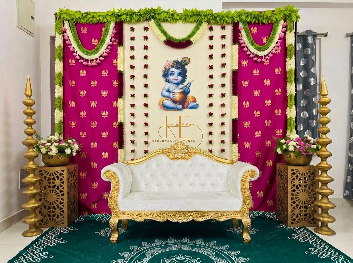 Perfect for families who want a colorful traditional theme, this setup blends festive decor with modern styling. Ideal for indoor naming ceremonies.
