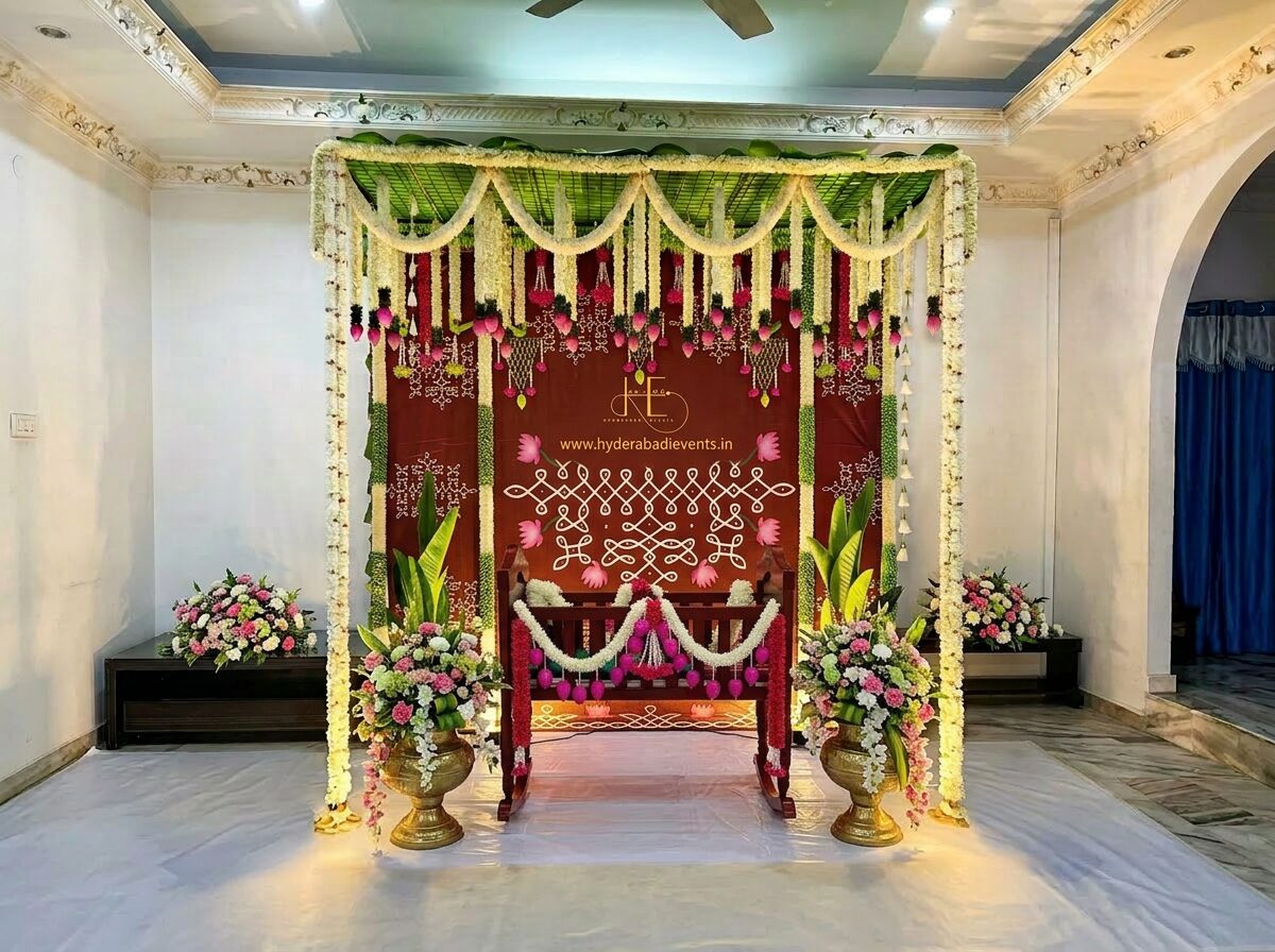 Designed for naming ceremonies and cradle functions, this setup delivers a grand traditional look with a modern premium touch.