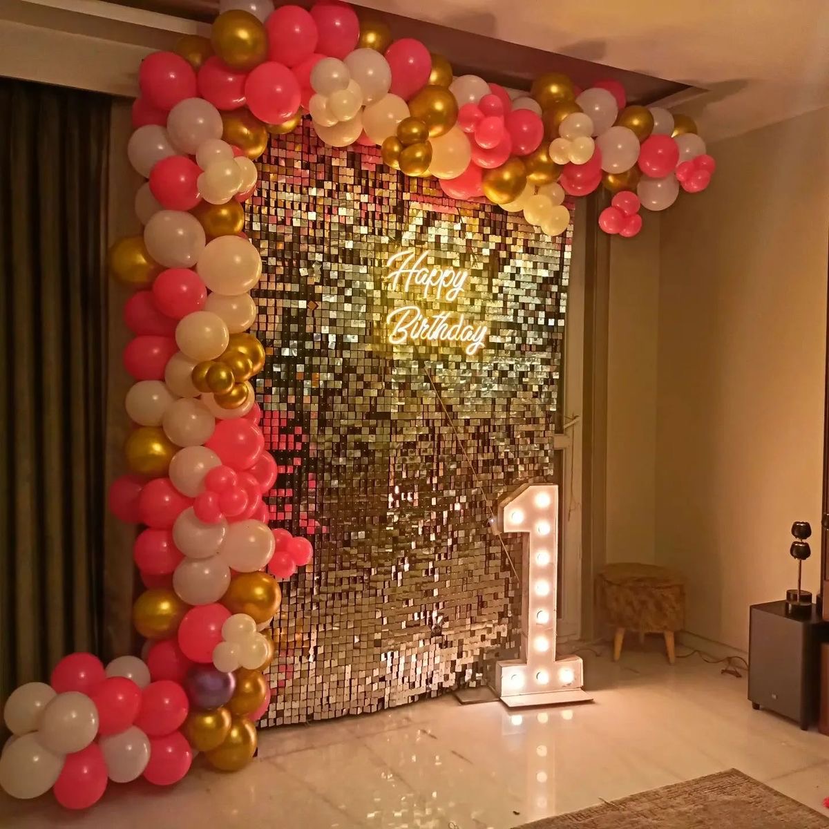 Luxury red and gold balloon birthday decoration setup including sequin shimmer backdrop, balloon garland and LED number lights perfect for birthday celebrations at home in Hyderabad.