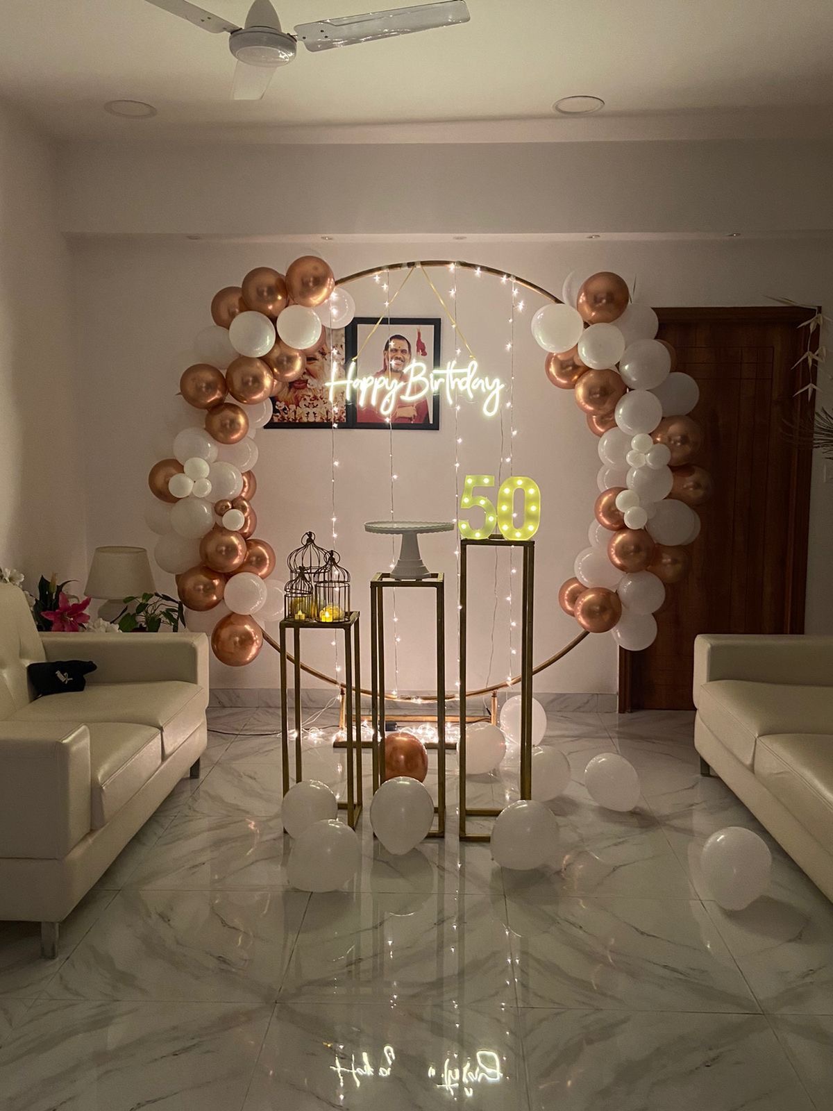 Luxury birthday decoration package including balloon ring backdrop, neon signage styling, milestone LED number props, cake table pedestal stands and elegant indoor event ambience for milestone celebrations.