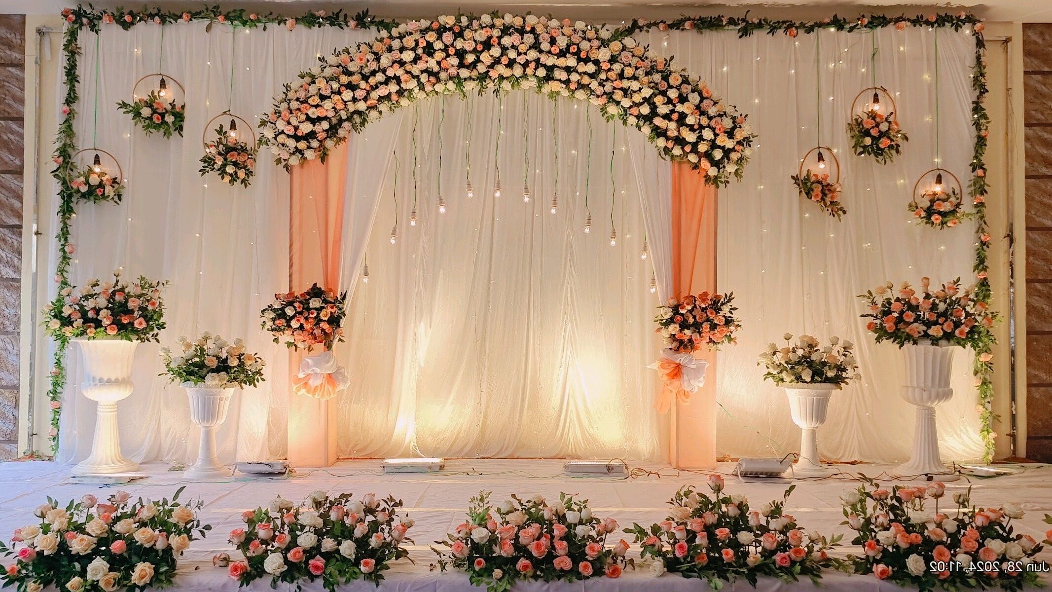 Our traditional engagement stage theme is designed to bring cultural richness and festive grandeur to wedding celebrations. The handcrafted floral framing and royal seating arrangement offer a majestic visual appeal suitable for traditional wedding events and family functions.