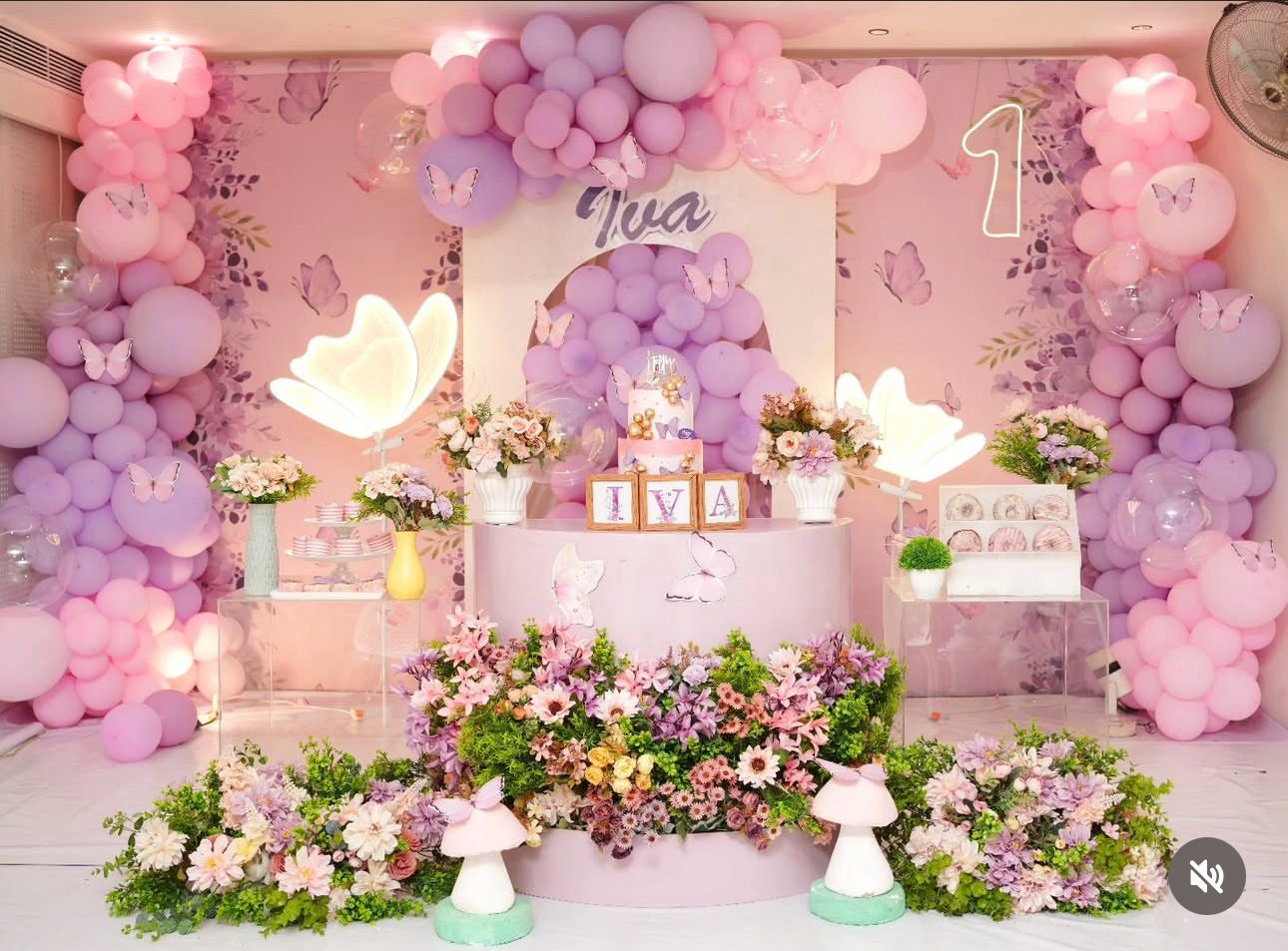 Pastel butterfly-themed first birthday party decoration set with balloon garland, floral arrangements, neon number “1”, personalized name display, and whimsical props.