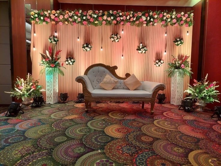 Premium engagement stage décor featuring white roses floral arch, greenery styling, curtain draping backdrop and designer couple sofa. Ideal for wedding reception, engagement ceremony and pre-wedding photography.